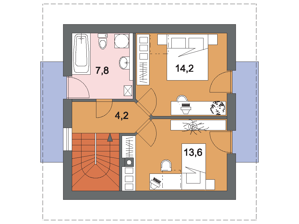 JANTAR 57/41 je dům menší velikostní kategorie s 3 obytnými místnostmi. Svými rozměry uspokojí nároky 3-4 členné rodiny. Rodinný dům je možné realizovat jako chatu. objekt je možné podsklepit. Rodinný dům je vhodný do rovinatého terénu. z boční strany je prostor na přistavění garáže.